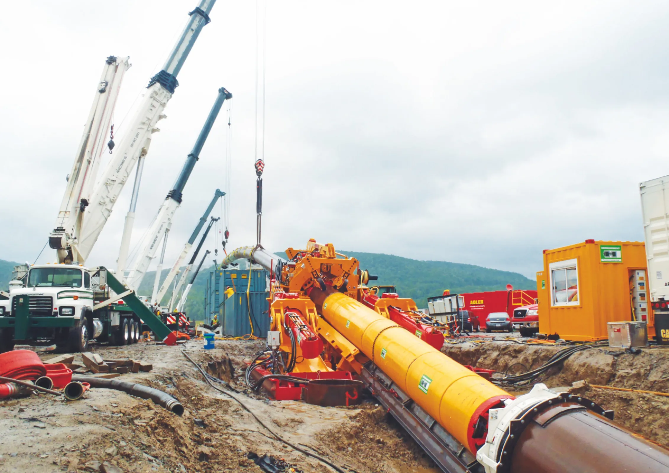 Direct Pipe® is a one-step installation method for underground crossings in pipeline construction. A Pipe Thruster is used to push a prefabricated pipeline from a launch pit through the ground to the target point. The soil is excavated at the face by a tunnel boring machine.